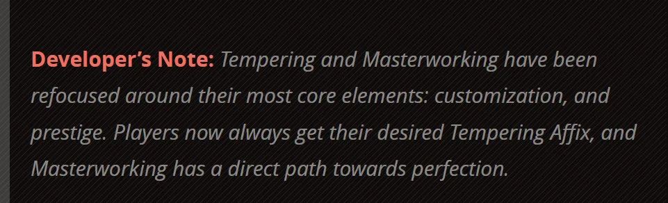 Tempering now allows you to select the desired affix, but you can only add one temper, in line with the adjustment from 3 to 4 stats on dropped items, keeping the total stats at 5. You can reroll as much as you want using scrolls. Masterworking introduces Refinement, which boosts base stats by up to 20% while upgrading one affix to GA with the Capstone roll after you reach quality level 20.